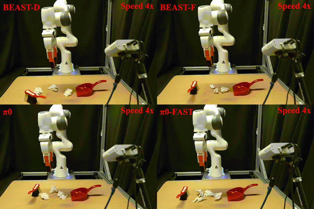 tokens using B-splines. In contrast to existing action tokenizers based on vector quantization or byte pair encoding, BEAST requires no separate tokenizer